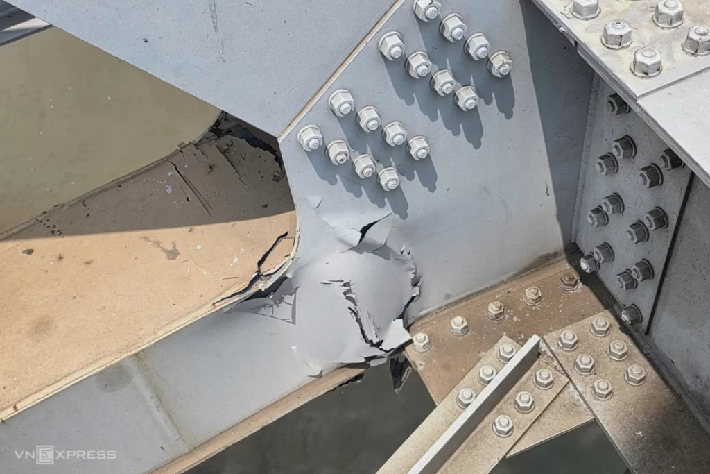 Dầm biên và một góc trụ cầu bị uốn cong, bong tróc sau vụ va chạm.